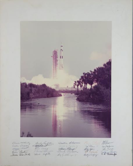 Apollo 13 Lift-Off – signed by 25 !! – 14″x11″ photo mounted on 20″x16″ display board
