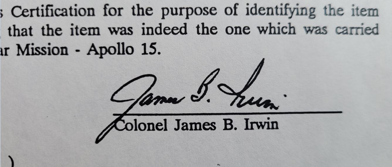 - A copy of the original certification from astronaut Jim Irwin.
