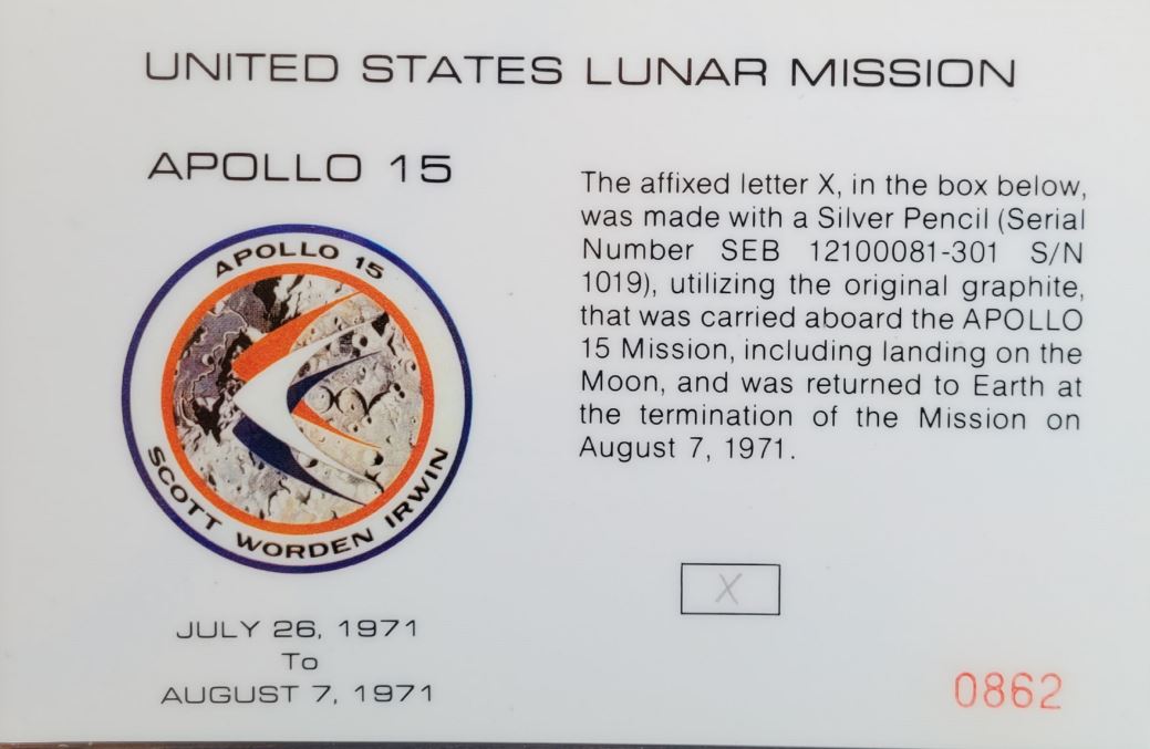 This card is part of a limited series created using the original graphite from the pencil carried by astronaut James Irwin during the mission. The pencil was used on the lunar surface, and the mark on this card was made post-flight to commemorate its journey.