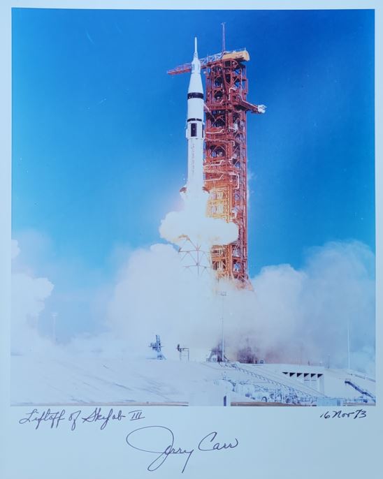 Signed photo of Jerry Carr – because when your commute involves 34 million miles and zero gravity, you deserve a launch photo that says, “I was literally above it all.”