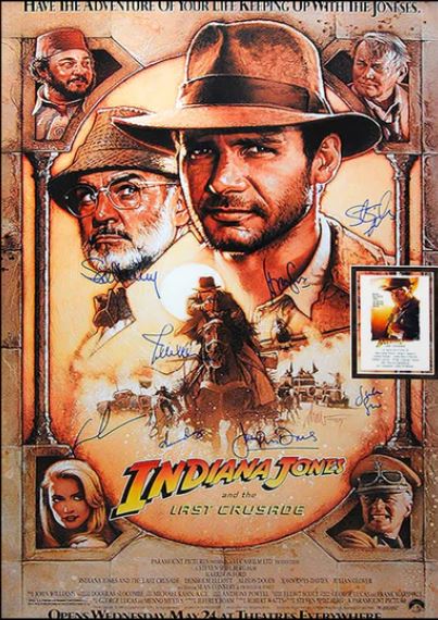 Indiana Jones and the Last Crusade Movie Poster – Autographed by 5 world famous actors from the main cast + composer John Williams, producer George Lucas and director Steven Spielberg – COA with numbered hologram