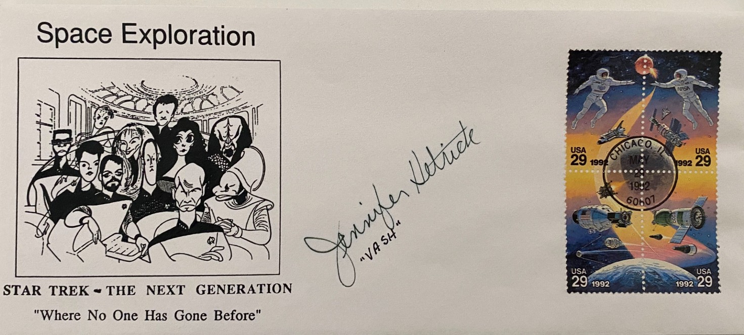 This signed 10″ x 4″ Star Trek: The Next Generation cover features the signature of Jennifer Hetrick, known for her role as Vash in Star Trek: The Next Generation who famously tangled with Captain Picard in “Captain’s Holiday” and “Qpid.” Vash’s mix of intellect, mystery, and mischief made her a standout in the Star Trek universe.