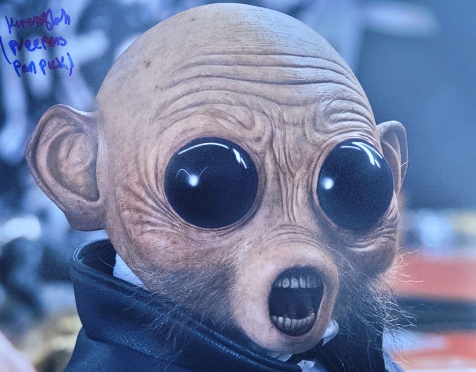 This photo captures the detailed costume and prosthetic work that brought Neepers Panpick to life—an example of the practical effects legacy that defines Star Wars. Whether you’re a fan of background aliens or building a tribute to the sequel trilogy, this signed photo is a standout piece.