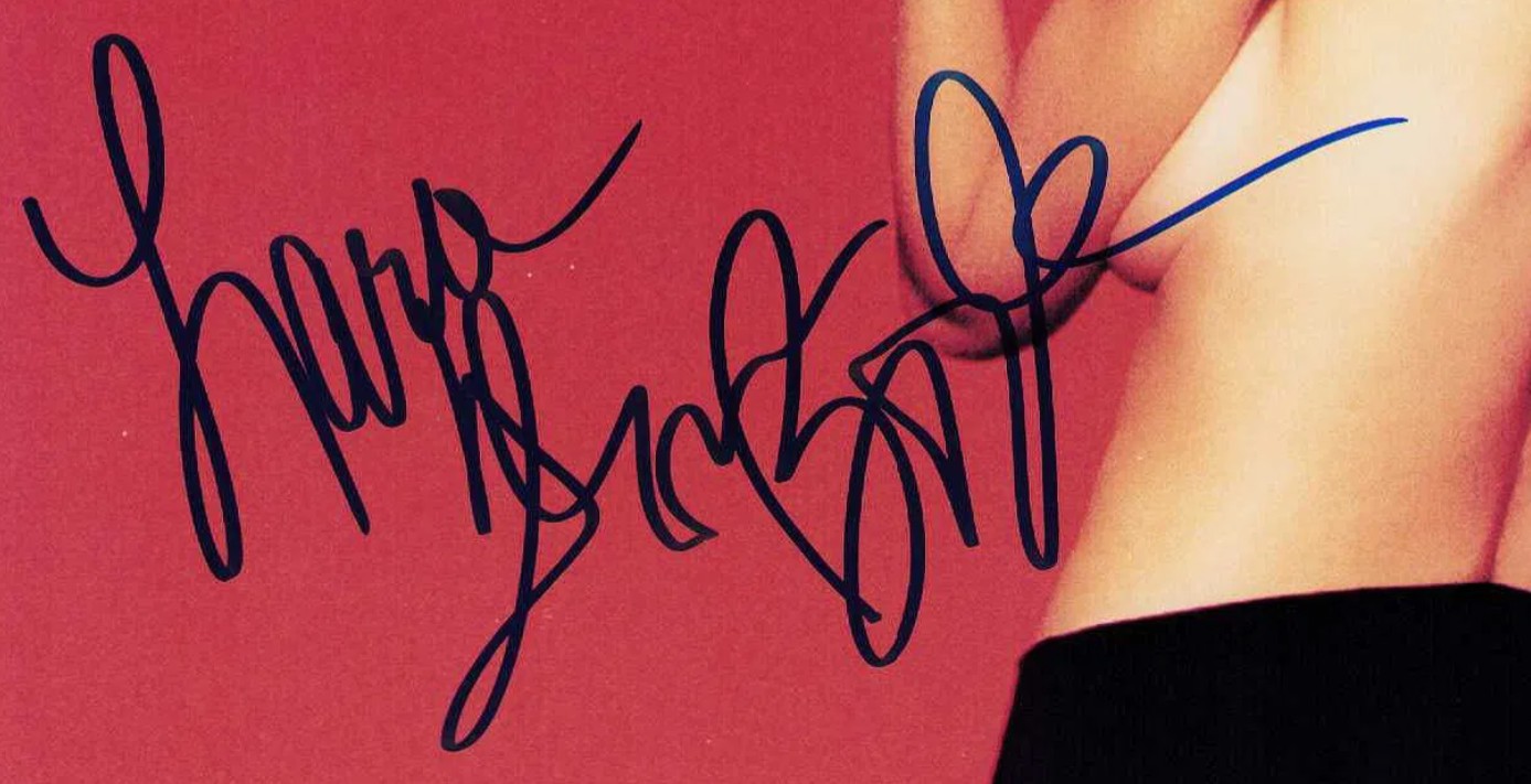 This signed 10″ x 8″ photograph features Lara Flynn Boyle against a bold red background, posed with her back toward the camera and a finger thoughtfully placed near her mouth. The composition gives the image a dramatic, editorial feel, making it an eye‑catching display piece for fans of 90s television, film and iconic photography styles.