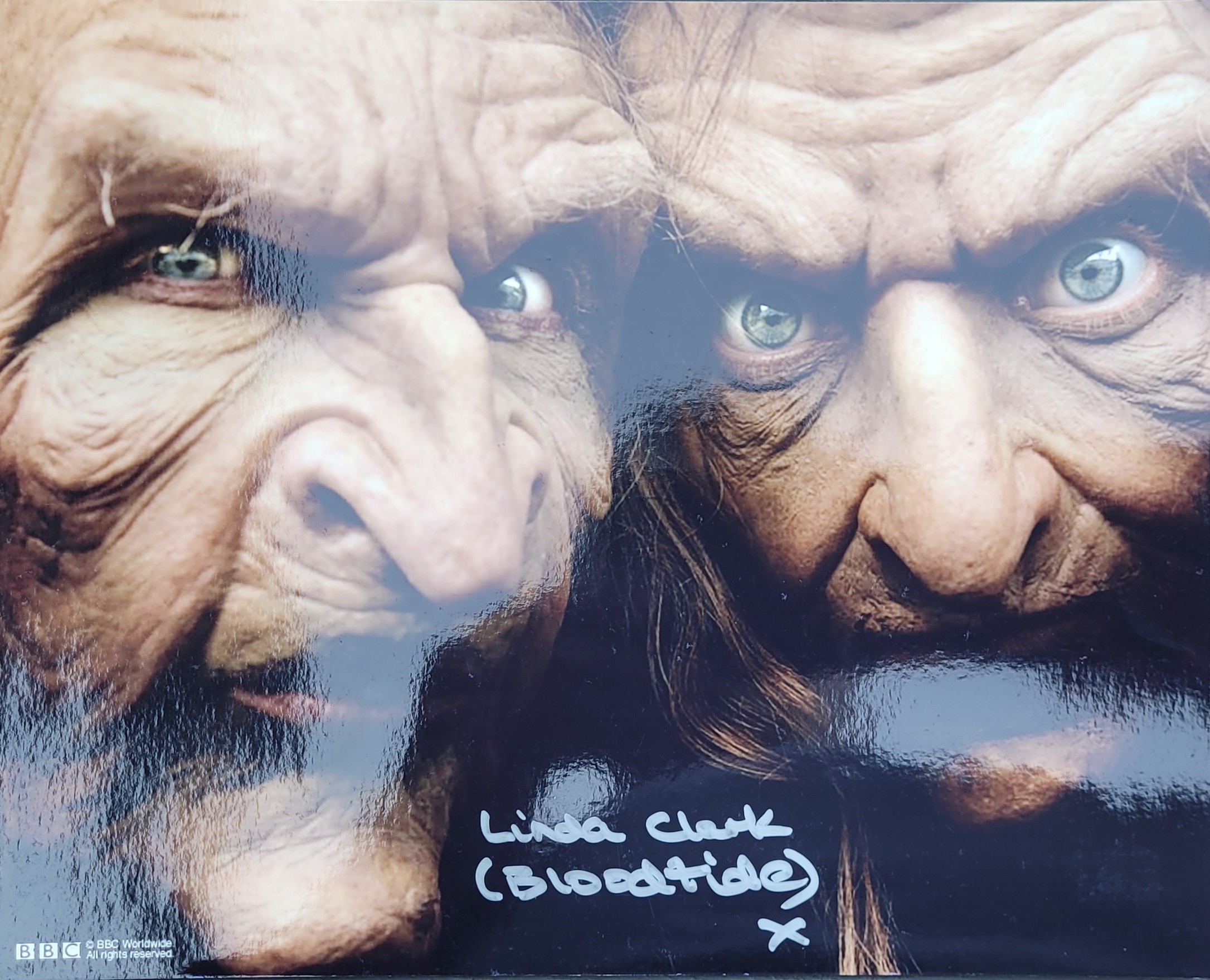 Signed photo of Linda Clark as Bloodtide in Doctor Who—a rare collectible for fans of classic villains and deep cuts from the Whoniverse.