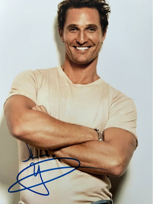 Signed photo of Matthew McConaughey. A confident crossed‑arm portrait that adds strong display appeal and showcases the charisma that makes his signed pieces popular among film collectors.