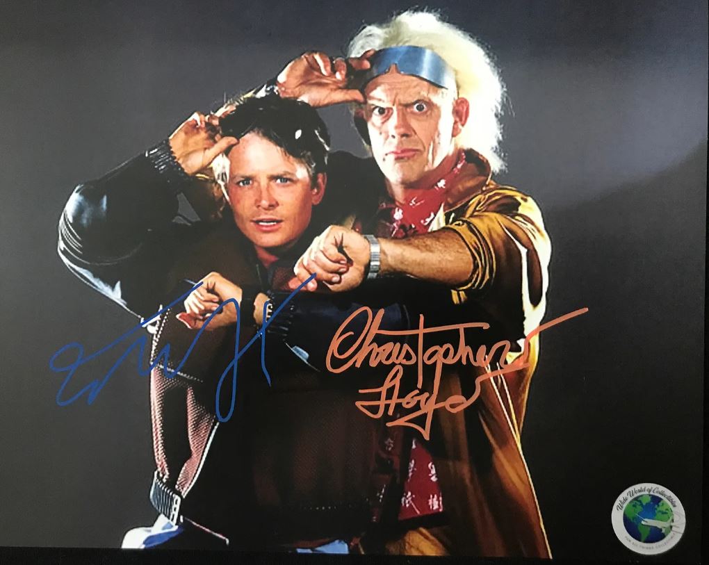 Authentic 8×10″ signed photo featuring Michael J. Fox and Christopher Lloyd as Marty McFly and Doc Brown. A rare and iconic collectible for fans of Back to the Future.