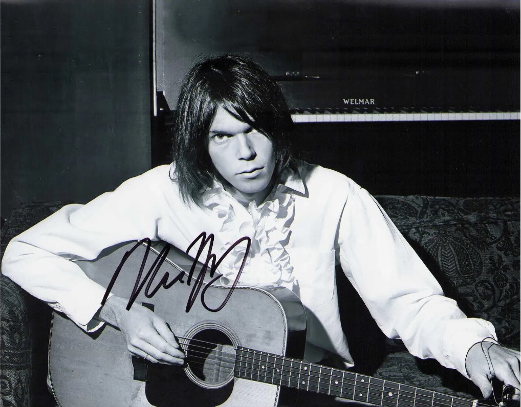 Signed photo of Neil Young with guitar in a striking black-and-white shot, a timeless piece of music history for your collection. Add some legendary rock vibes to your wall and let this piece play the perfect note in your display.