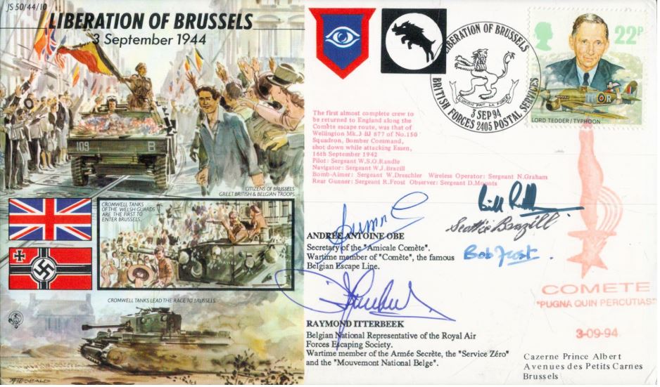 Own a powerful piece of European wartime history with this multi-signed commemorative cover, honoring the liberation of Brussels in 1944. Originally signed by Raymond Itterbeek, a member of the Belgian resistance and the Comet Line, this edition also features the signatures of Bob Frots and Bill, adding further historical depth and rarity to the piece.