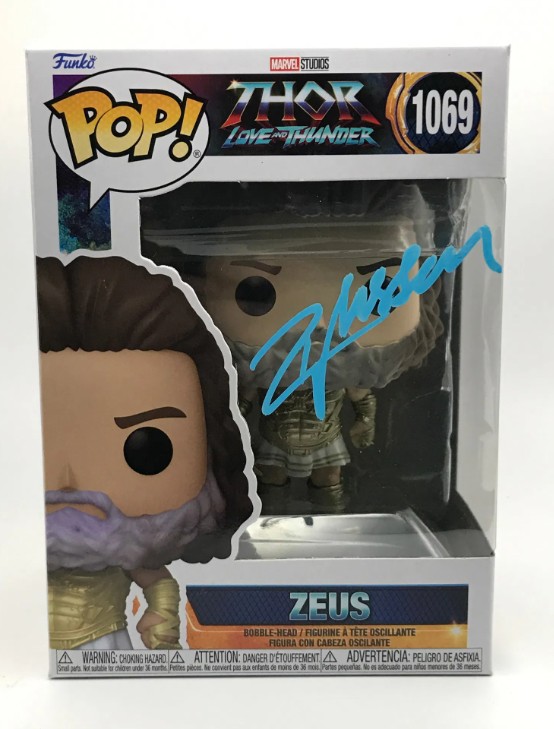 Bring some thunderous MCU energy into your collection with this signed Funko Pop #1069 of Russell Crowe as Zeus from Thor: Love and Thunder. This collectible captures the character’s flamboyant and comedic presence in the film and adds a lively centerpiece for Marvel fans, Funko enthusiasts, and autograph seekers.