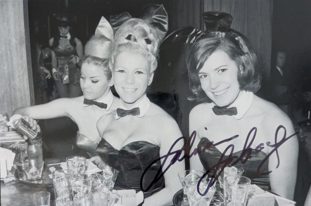 This autographed photo features Sabrina Scharf at the legendary New York City Playboy Club. Captured in a classic black-and-white image from 1963, Scharf is seen serving drinks alongside fellow Bunnies, dressed in the signature corseted outfit complete with rabbit ears and tail—a timeless symbol of mid-century glamour and nightlife.