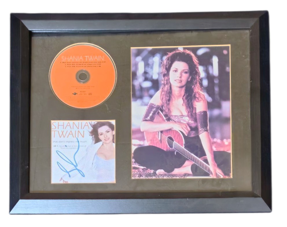 Shania Twain – signed CD insert “That don’t impress me much” mounted and framed with disc and color photo – approx. 16″x12″ perspex frame
