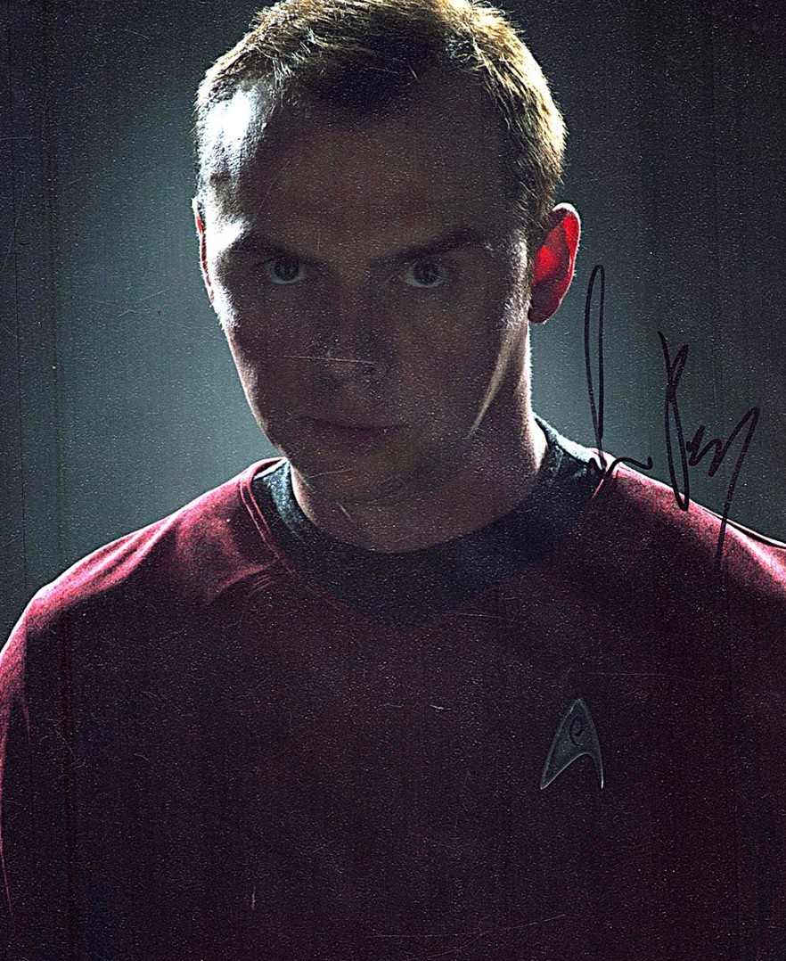 Signed photo of Simon Pegg as Montgomery “Scotty” Scott in Star Trek. Energize your collection. Grab this sautograph before it vanishes into the transporter!