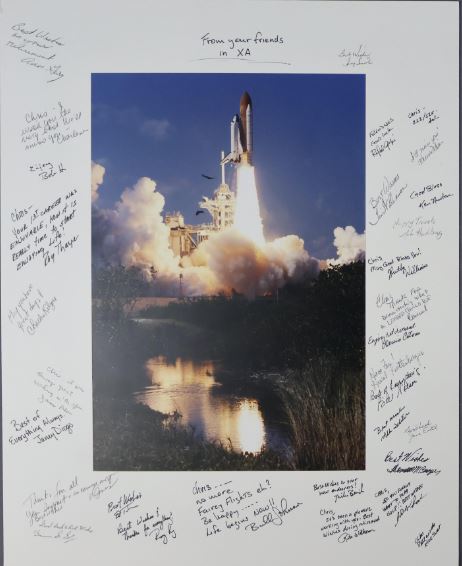 The display is adorned with 30 signatures and personal dedications from members of the Space Shuttle team, making this a truly unique and historic collectible.