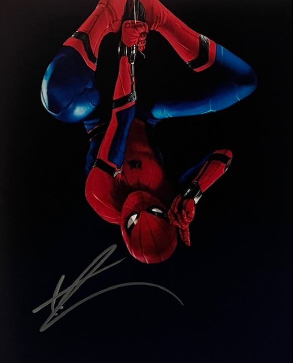 This autographed photo features Tom Holland as Spider-Man, captured in a powerful kneeling pose against a stark black background. The image evokes a moment of reflection and resilience—perhaps just after a fierce battle—where the weight of responsibility and sacrifice is etched into every line of the suit. It’s a striking visual that blends vulnerability with heroism, reminding fans why Peter Parker remains one of Marvel’s most relatable icons.