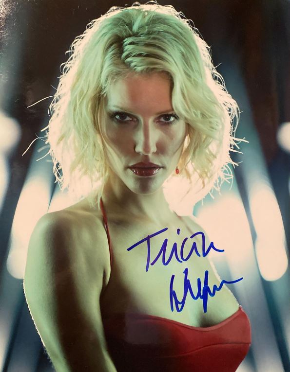 This signed photo honors Tricia Helfer’s contribution to Battlestar Galactica and her enduring appeal in science fiction.