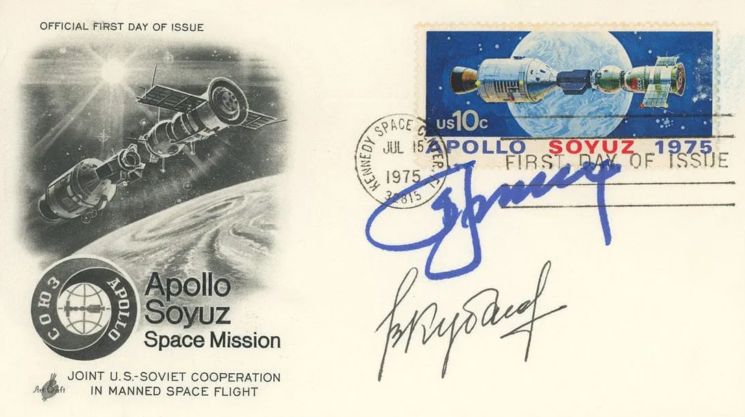Celebrate a defining moment in space diplomacy with this signed 6.5″ x 4.5″ cover featuring Soviet cosmonauts Alexei Leonov and Valery Kubasov, the Soyuz 19 crew in the historic Apollo–Soyuz Test Project. This commemorative item marks the first international crewed space mission, launched in July 1975, symbolizing Cold War détente and the beginning of global cooperation in human space exploration.